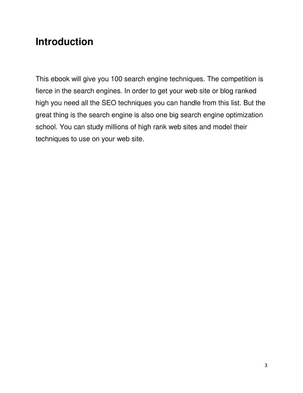 This ebook will give you 100 search engine techniques. The competition is fierce in the search engines. In order to get your web site or blog ranked high you need all the SEO techniques you can handle from this list. But the great thing is the search engine is also one big search engine optimization school. You can study millions of high rank web sites and model their techniques to use on your web site.